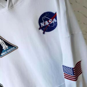 - Sewn Space patches at front and on sleeves