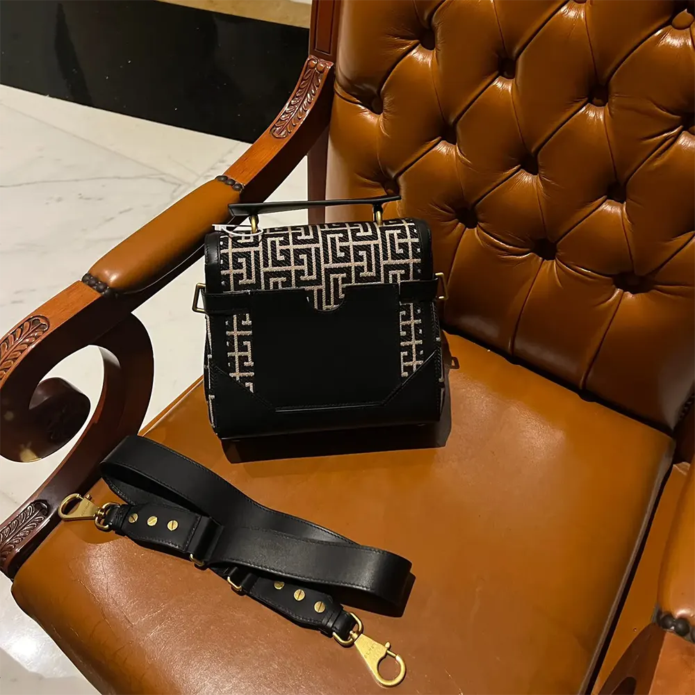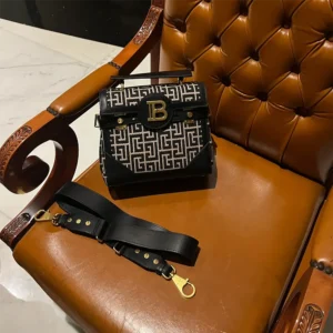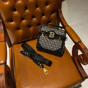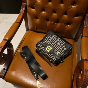 - Adjustable and detachable leather shoulder strap with Balmain-engraved lobster clasps