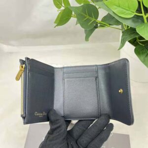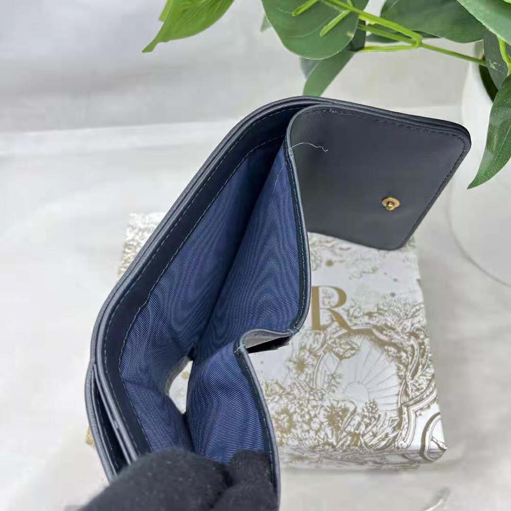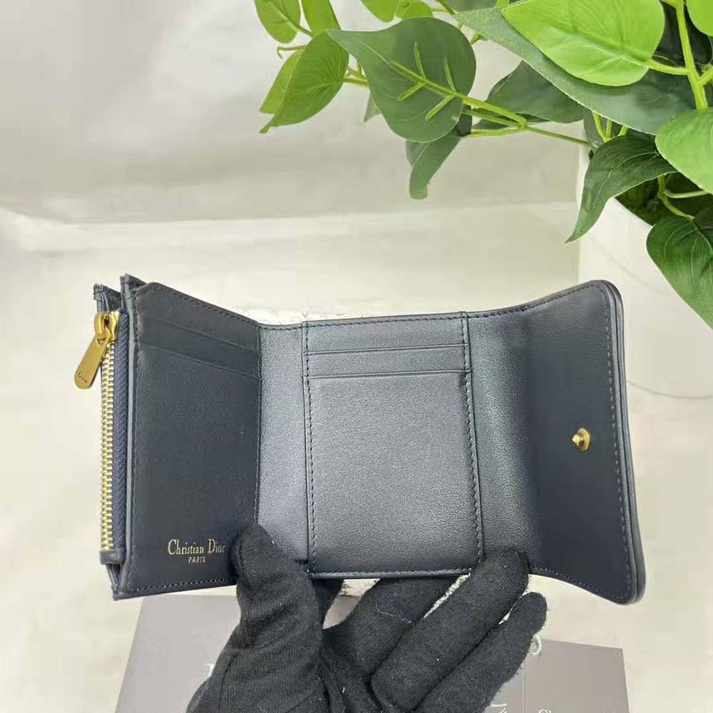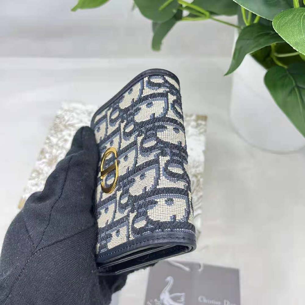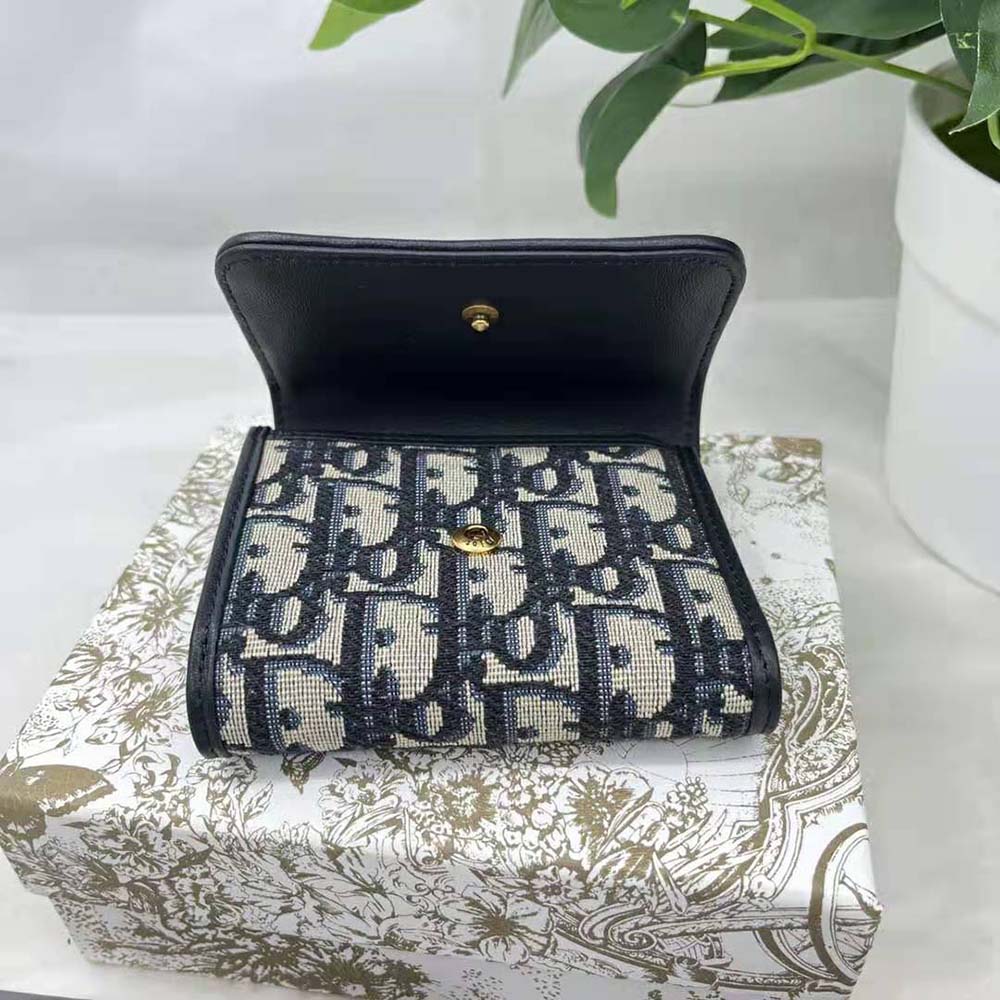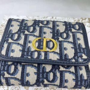 - The 30 Montaigne Lotus wallet, crafted in blue jacquard, has a compact shape.