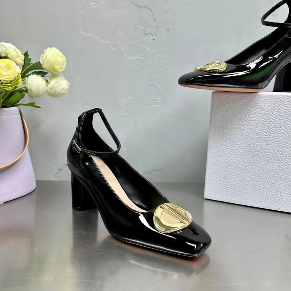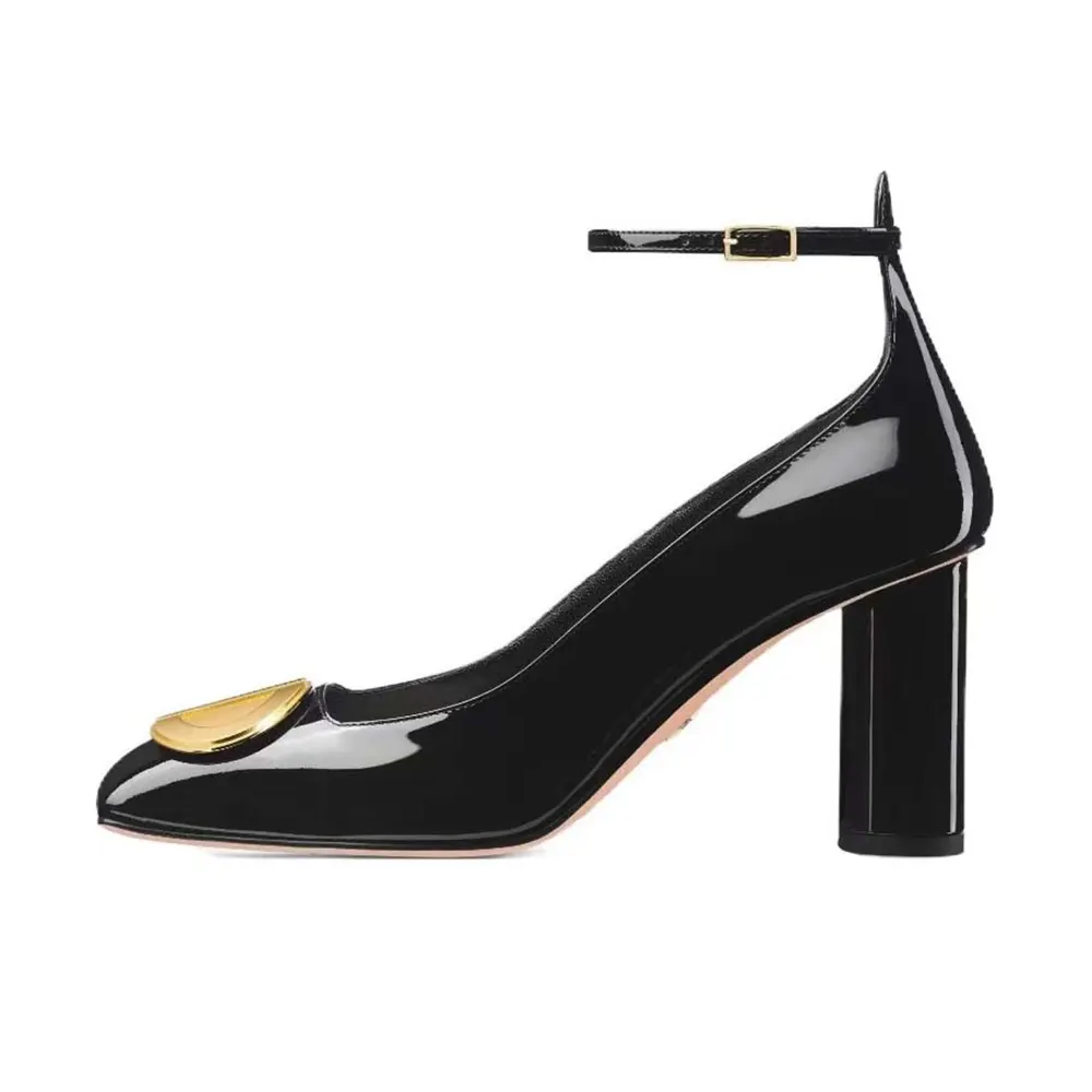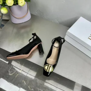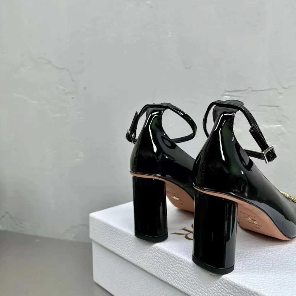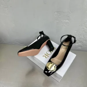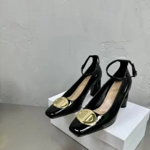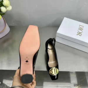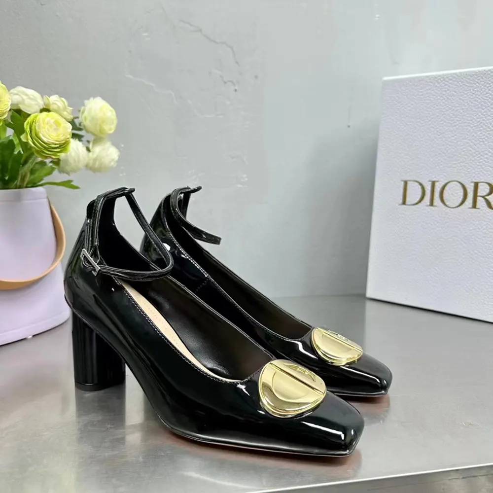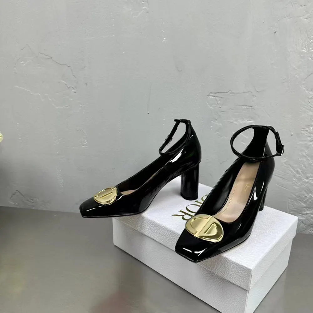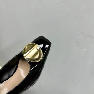 - The black patent calfskin upper showcases a shiny gold-finish metal CD signature on a satin-finish plate,