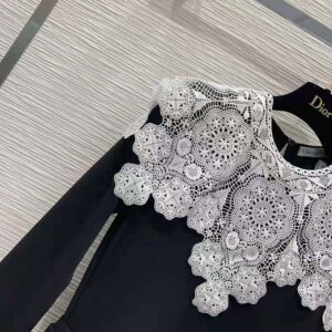 - it is distinguished by its flared cut enhanced by pleats and a plastron in white lace.