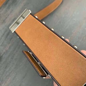 - brown leather details and studs.