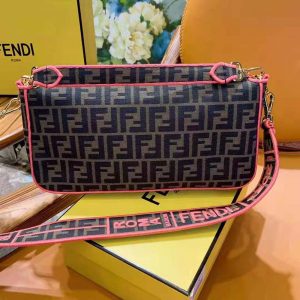 • decorated with an FF clasp and trimmed with fluorescent pink embroidery.