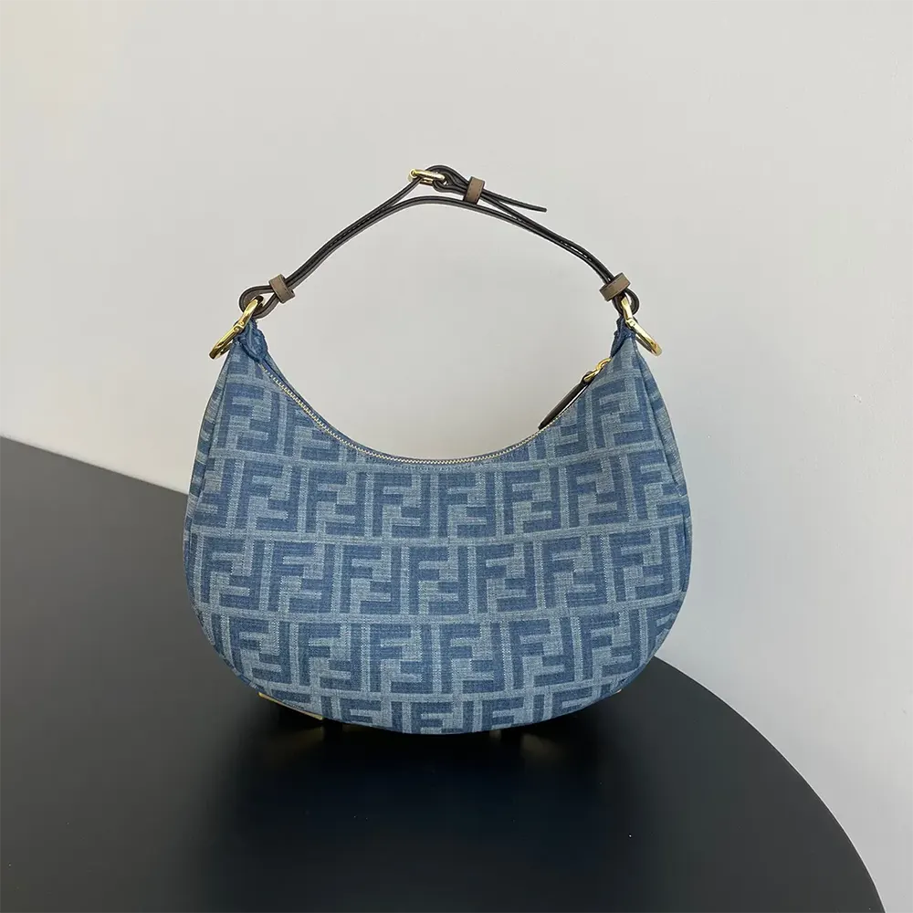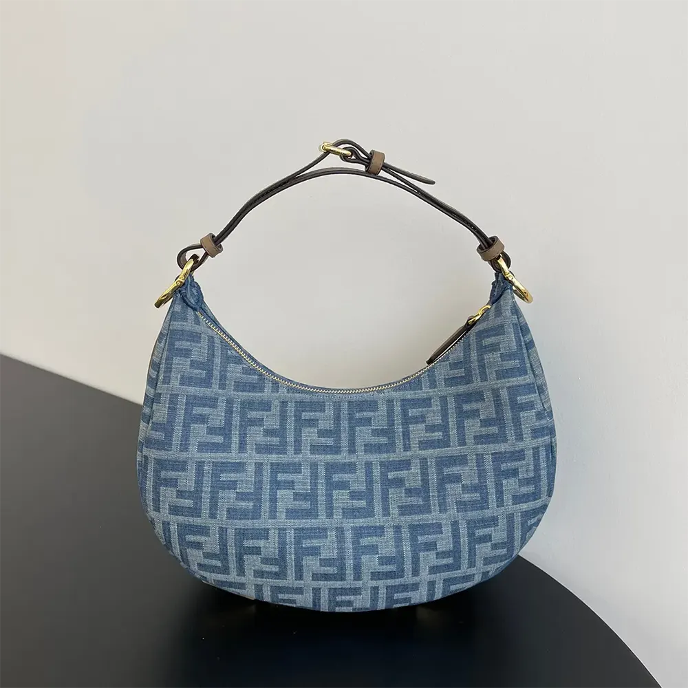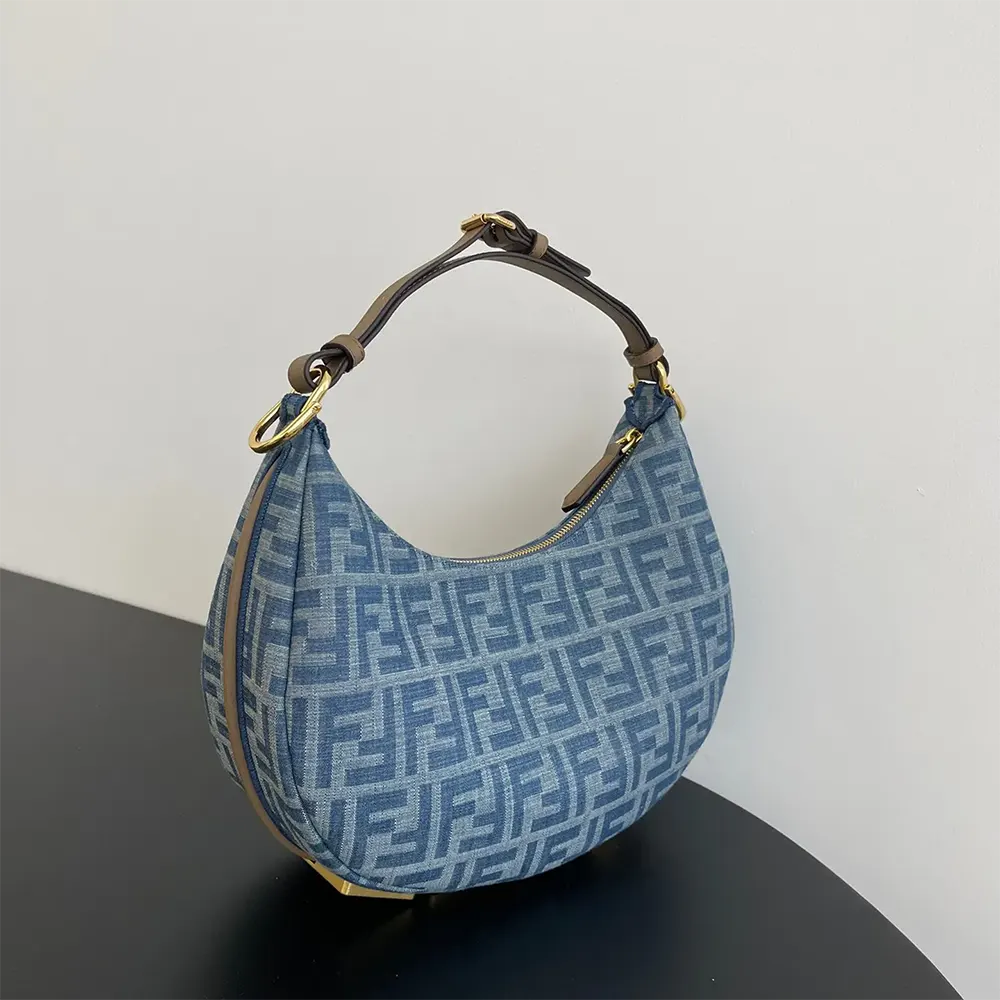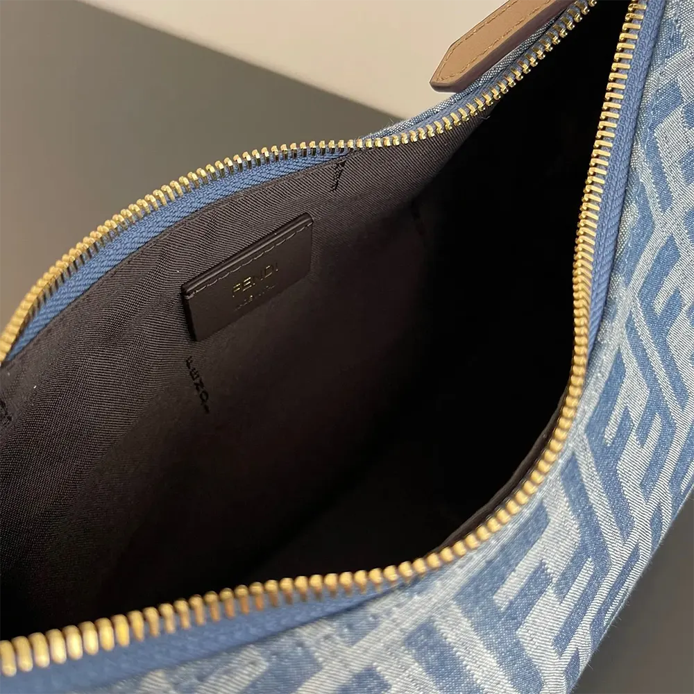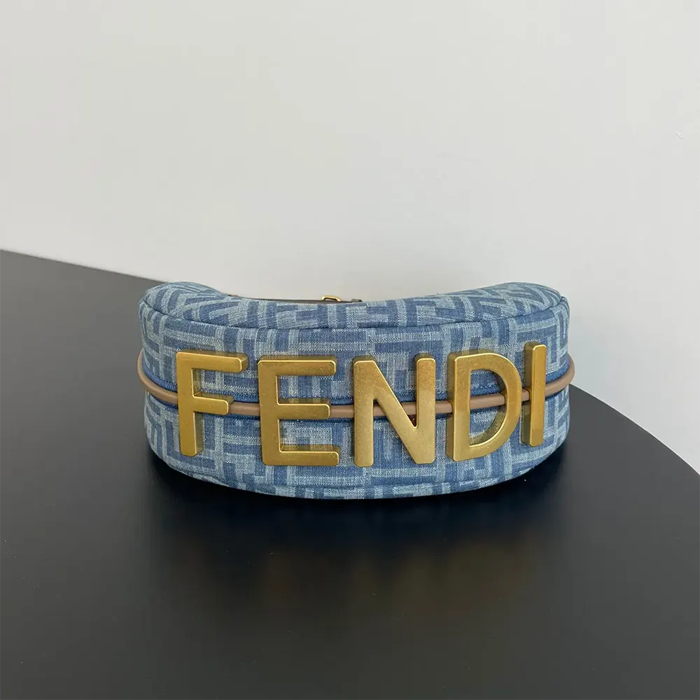 - trimmed with beige calfskin and embellished with vintage gold metal FENDI lettering at the bottom,