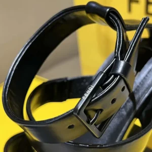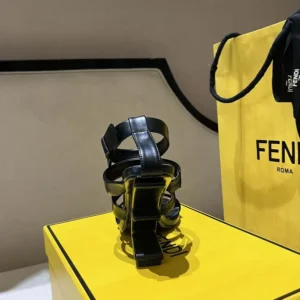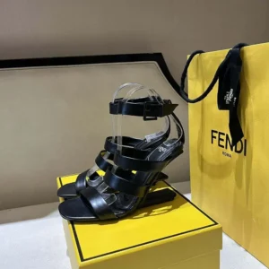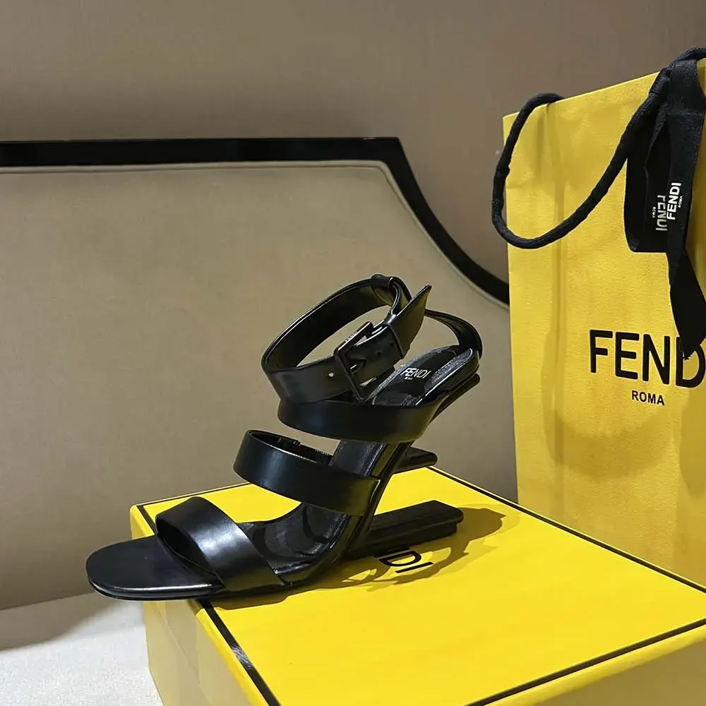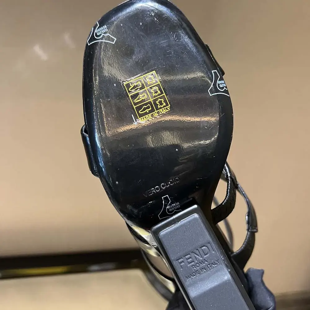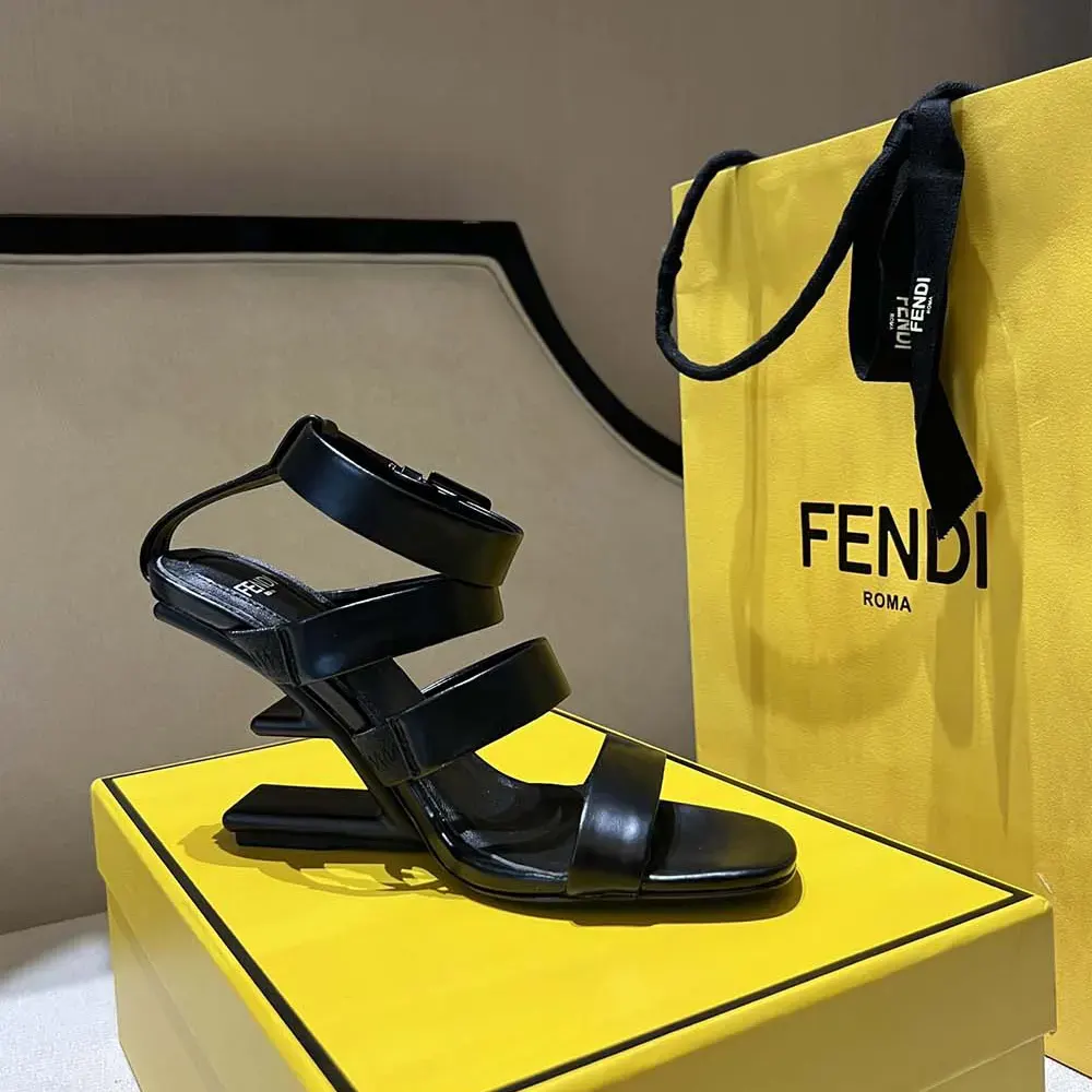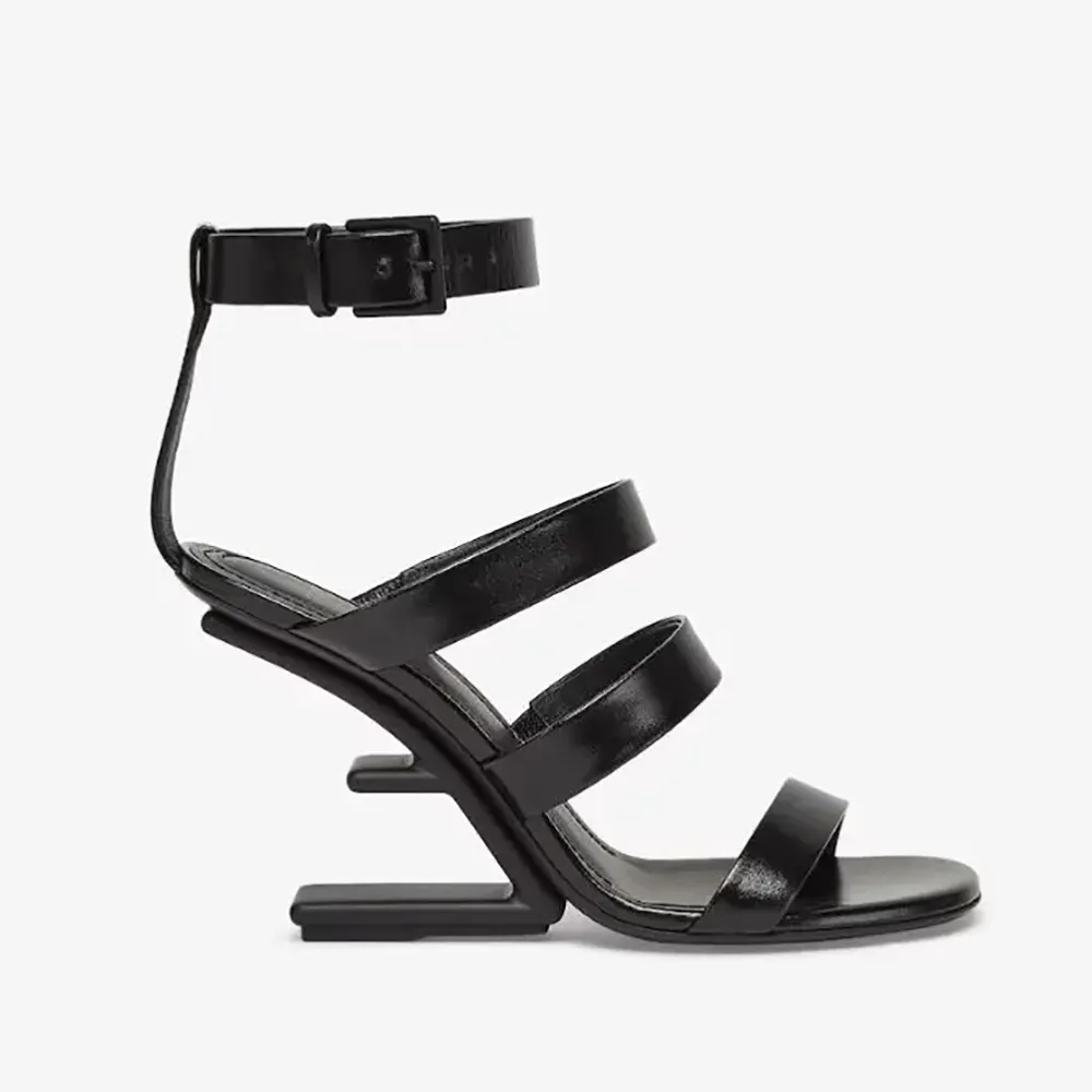 - Diagonal F-shaped sculpted heel in tone-on-tone enameled metal.