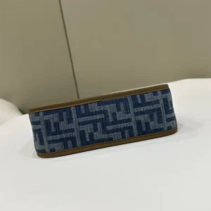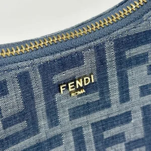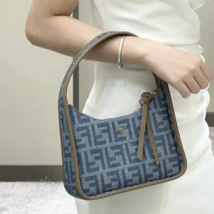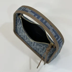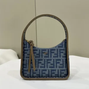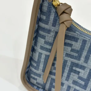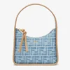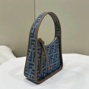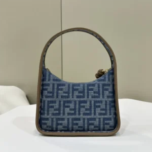 • Compact yet spacious mini Fendessence hobo bag made of denim-look light blue fabric and an FF motif.
