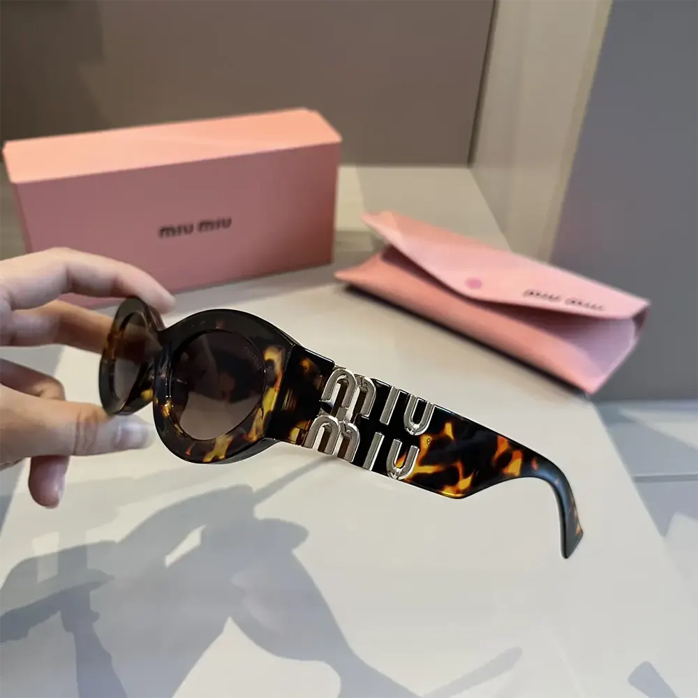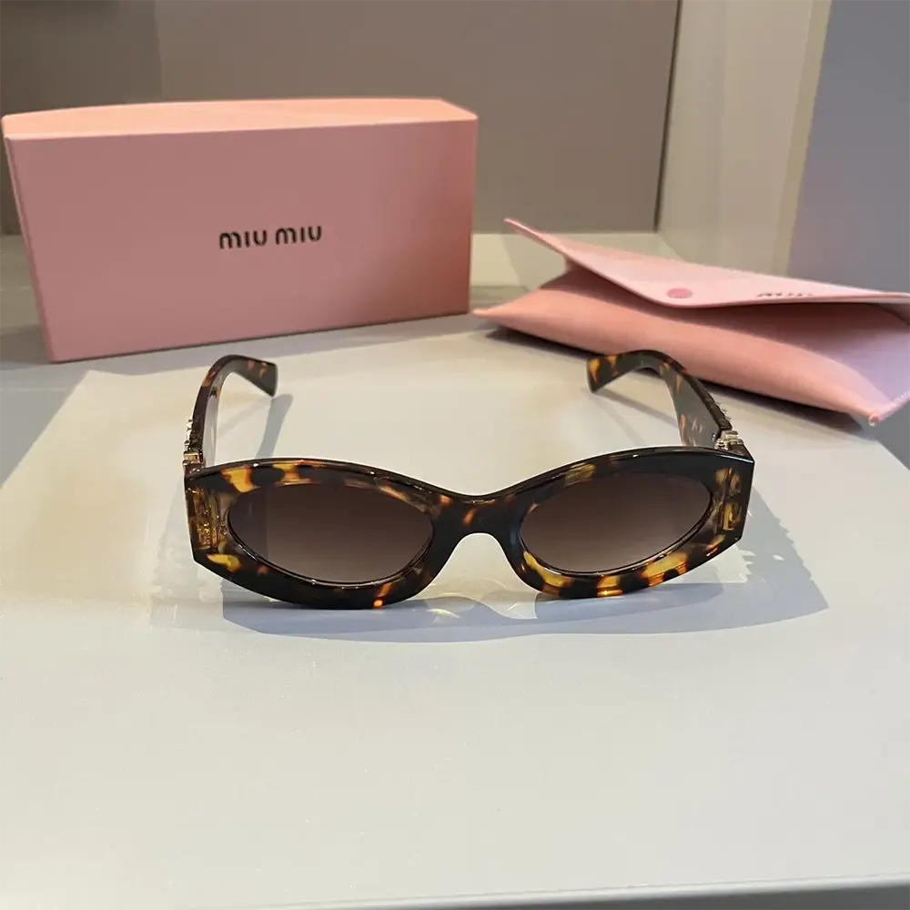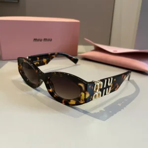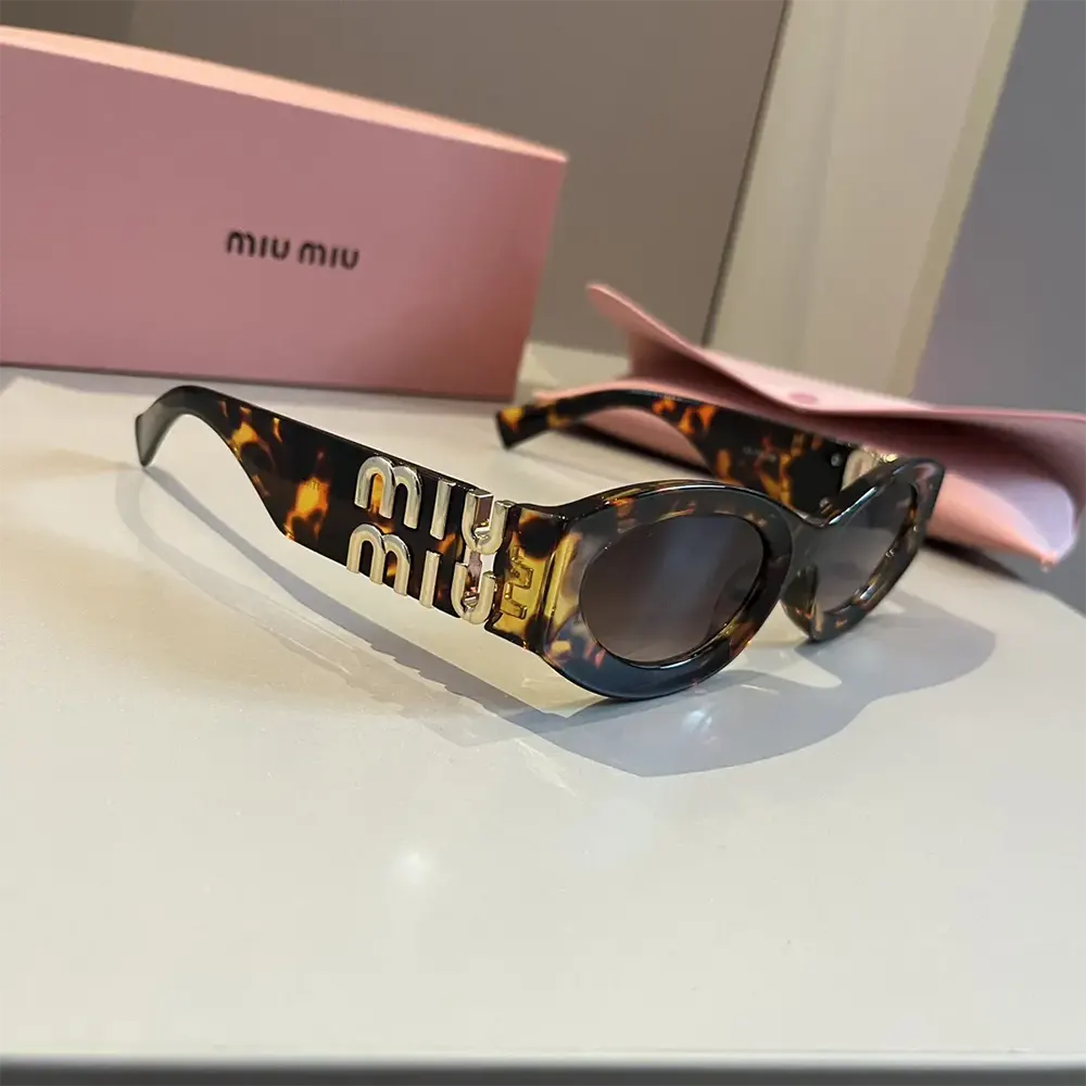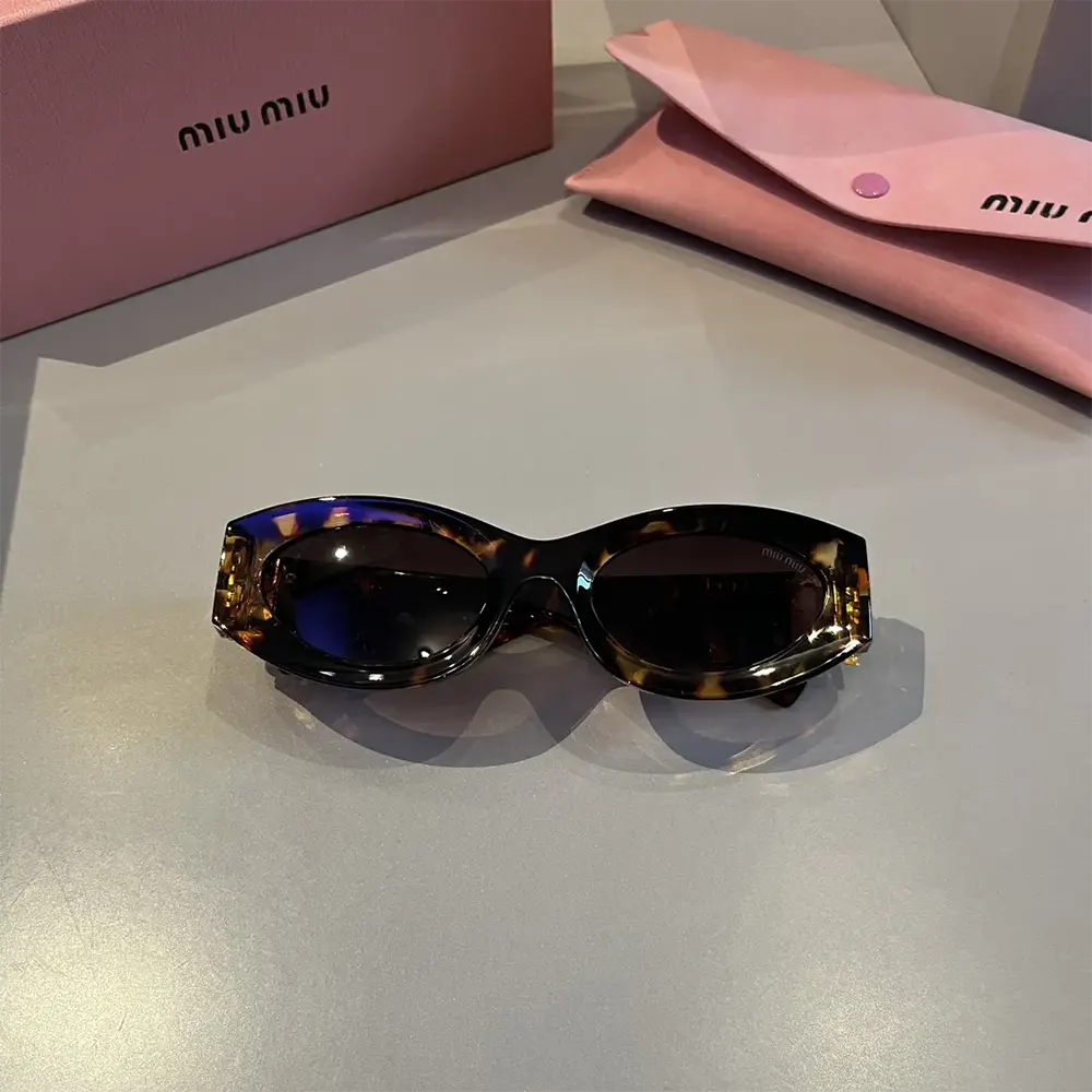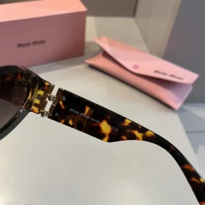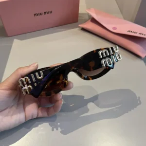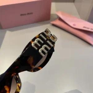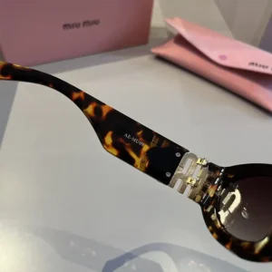 - The narrow silhouette of the frame front is enhanced by the vertical Miu Miu logo integrated into the hinge of the temples.