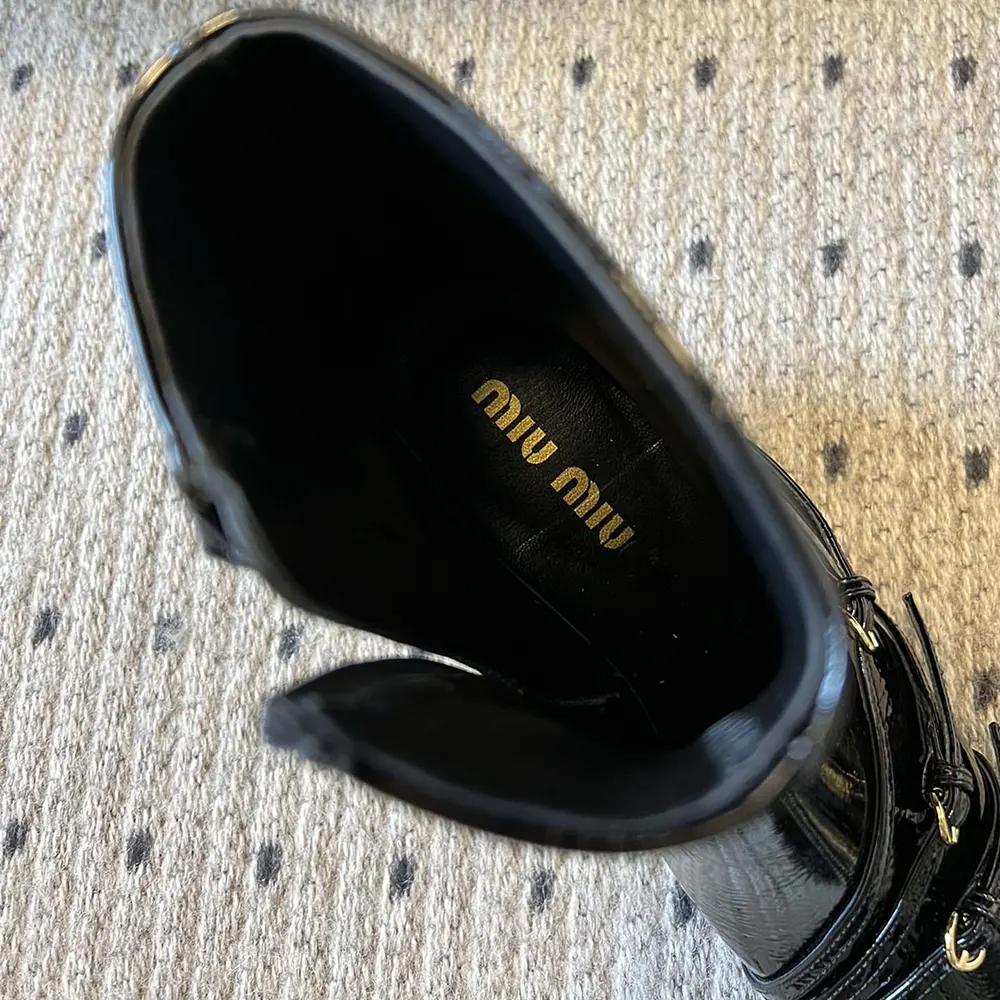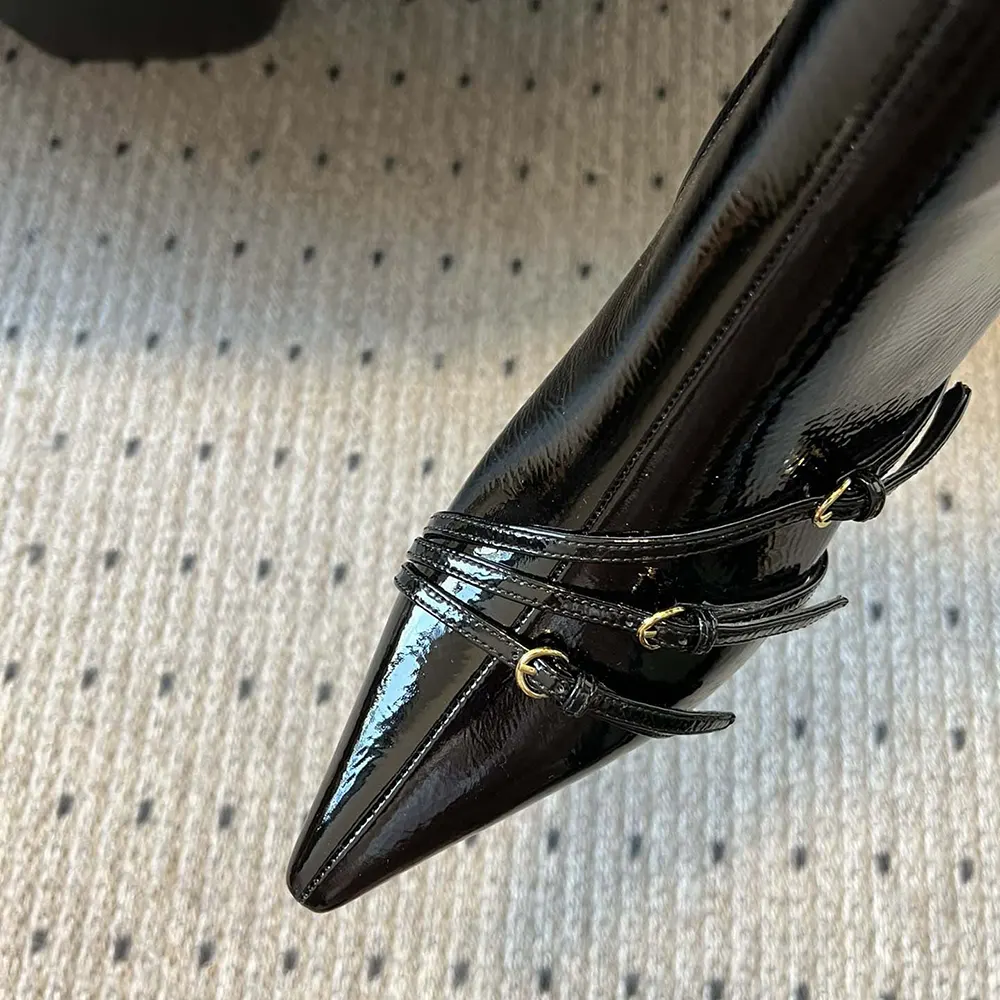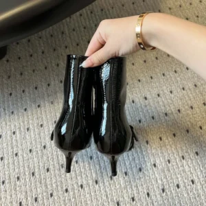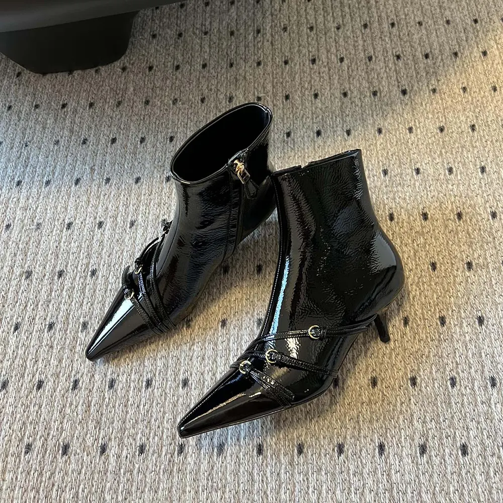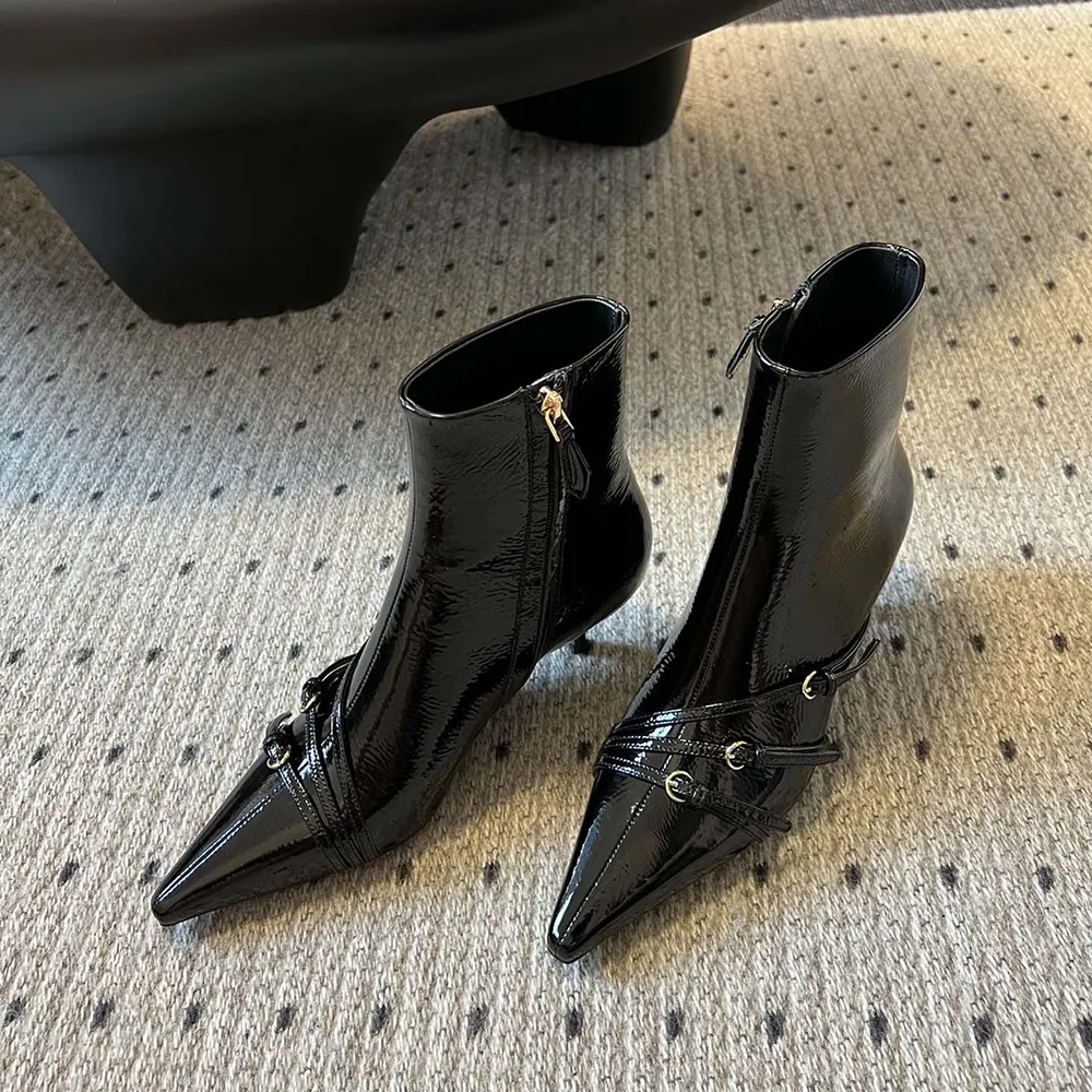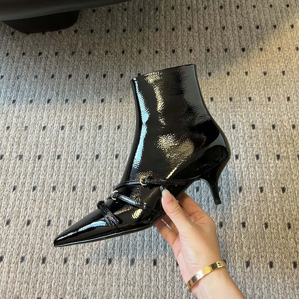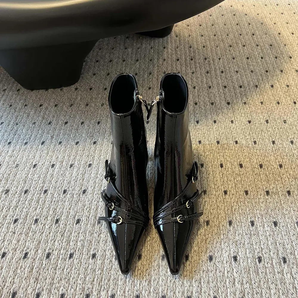 - This patent leather naplak booties inspired by iconic slingbacks stand out for their unique silhouette and the small buckle detail,