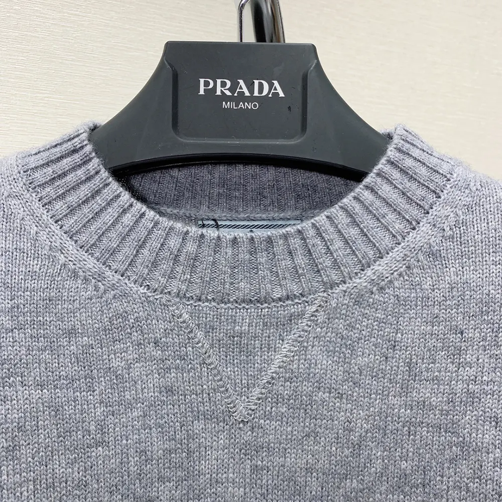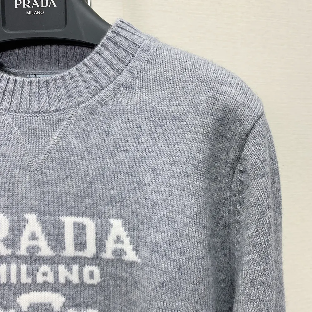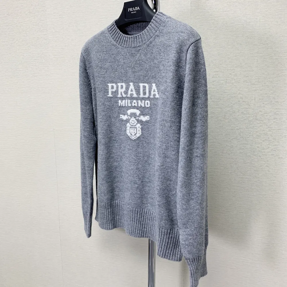 - The Prada logo is presented as an intarsia that decorates this wool and cashmere crew-neck sweater.