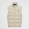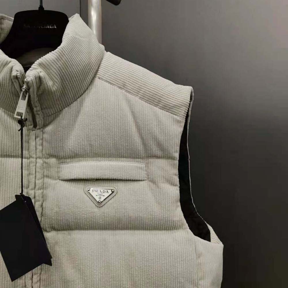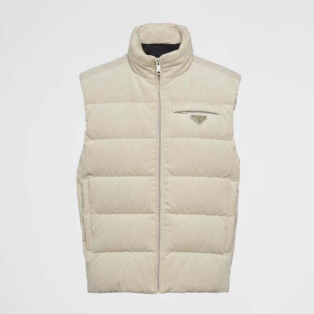 • Prada’s hybrid character is expressed in this cropped corduroy down vest.