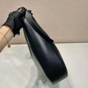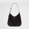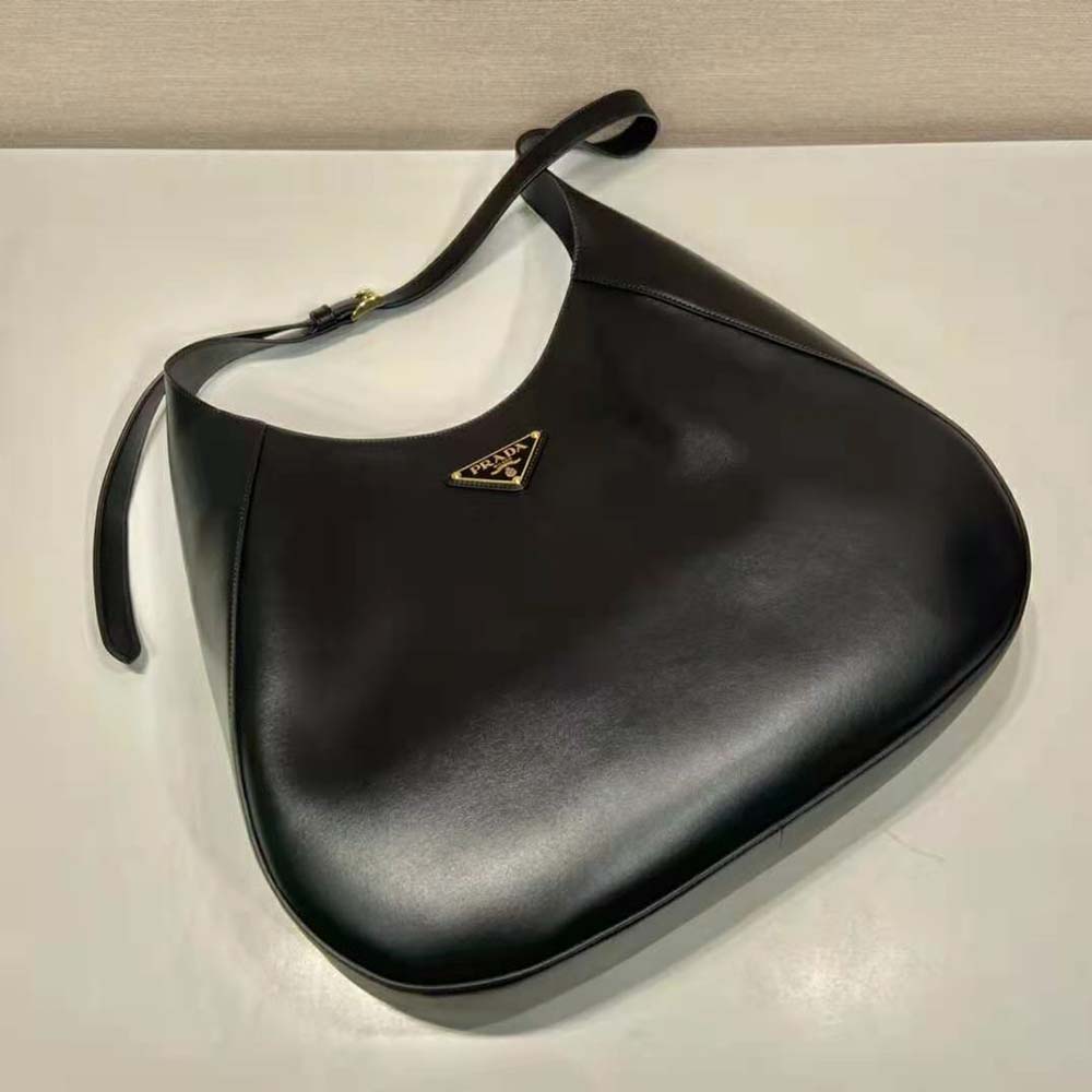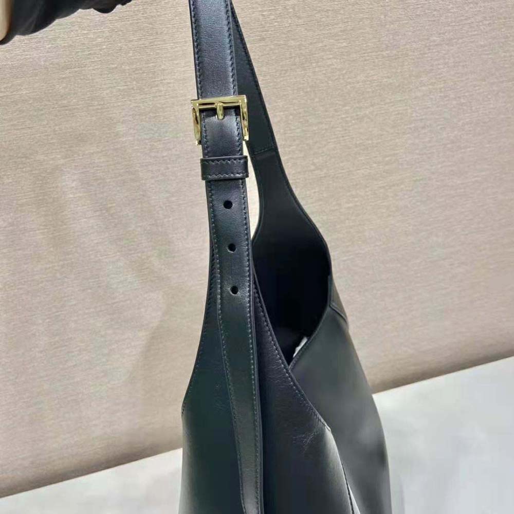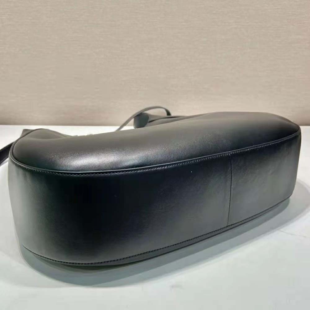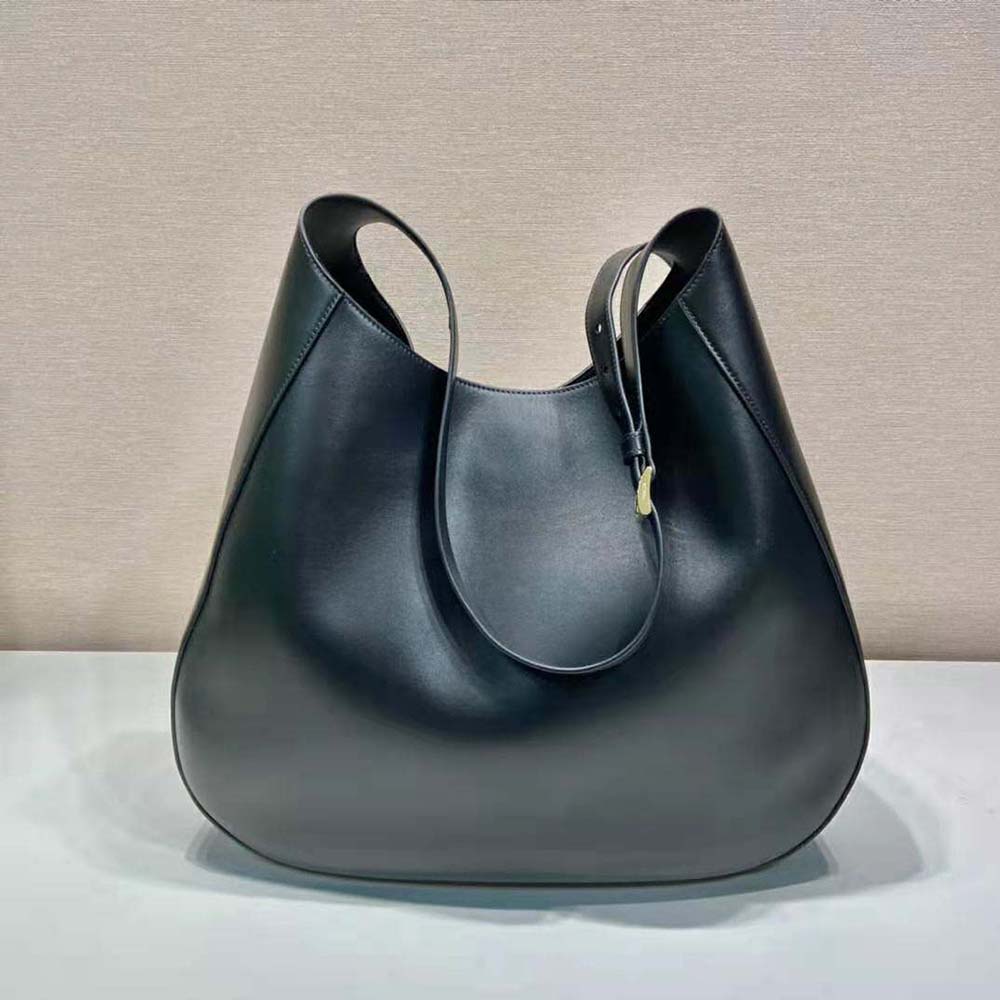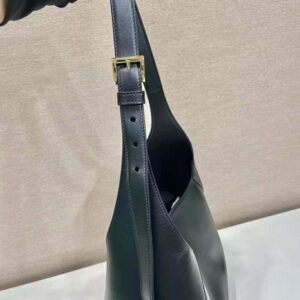 - A bold and refined silhouette characterizes this leather shoulder bag with fine details.