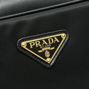 - The metal hardware and the enameled metal triangle logo adorn the style,