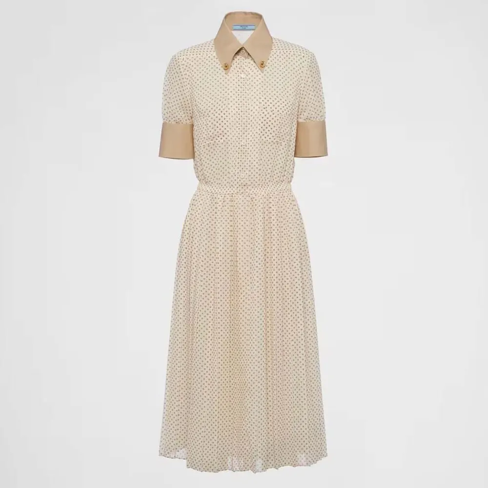 - The collar and sleeve cuffs in a contrasting color define the georgette style