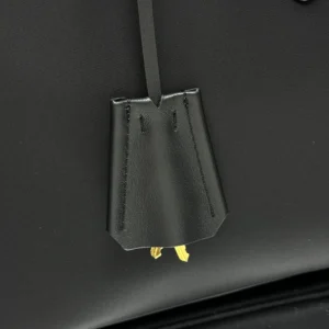 - The metal hardware and the enameled metal triangle logo adorn the style,