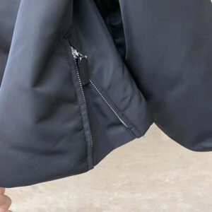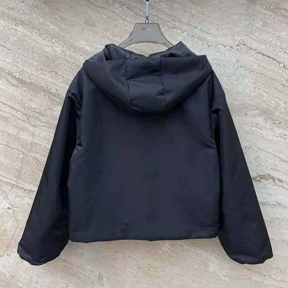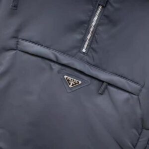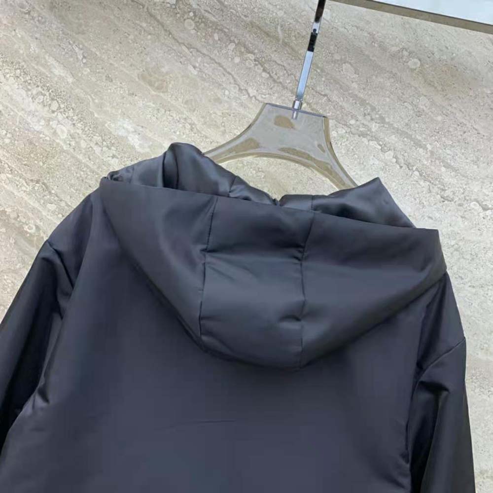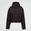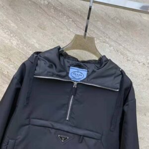 - The garment featuring technical details such as a hood and elasticized cuffs