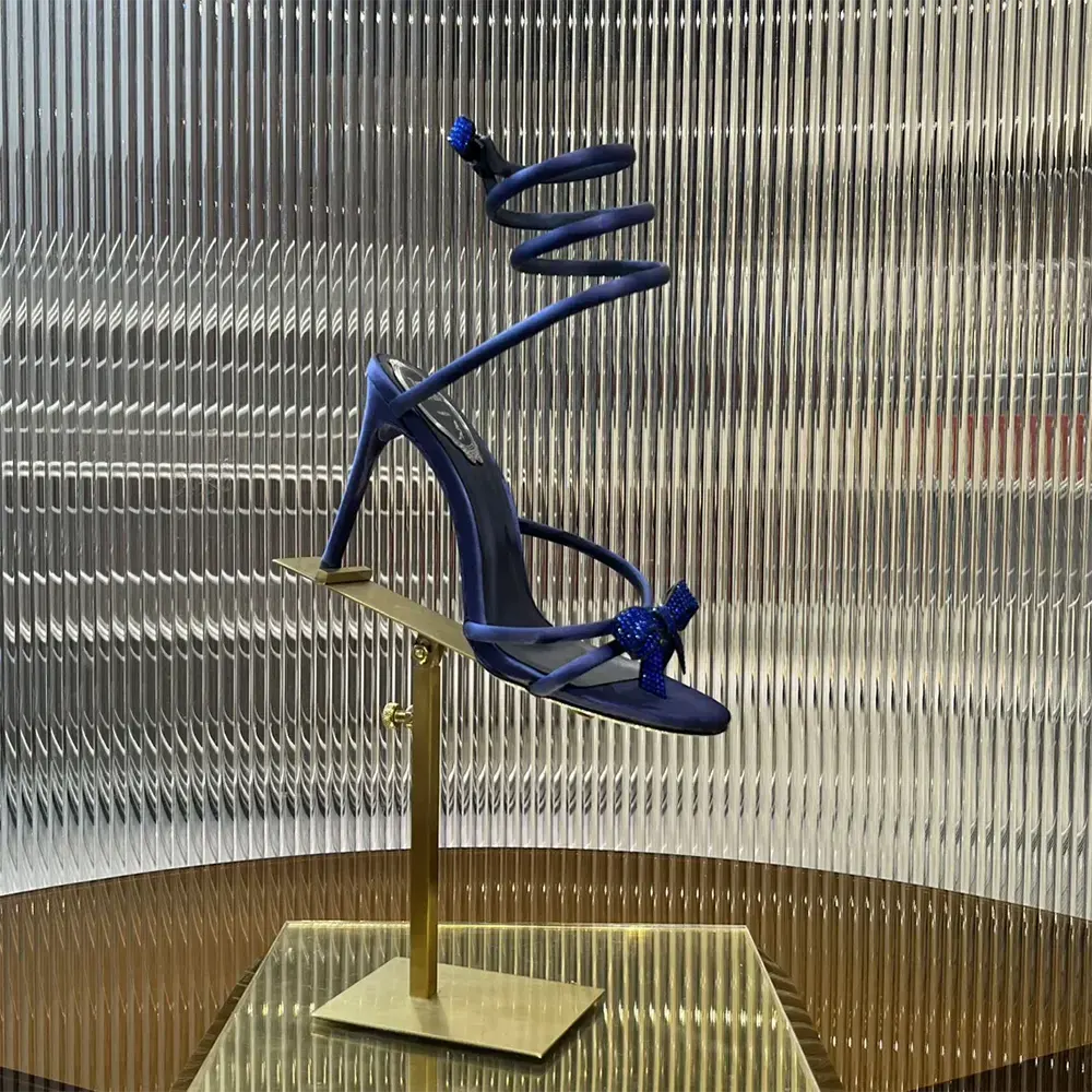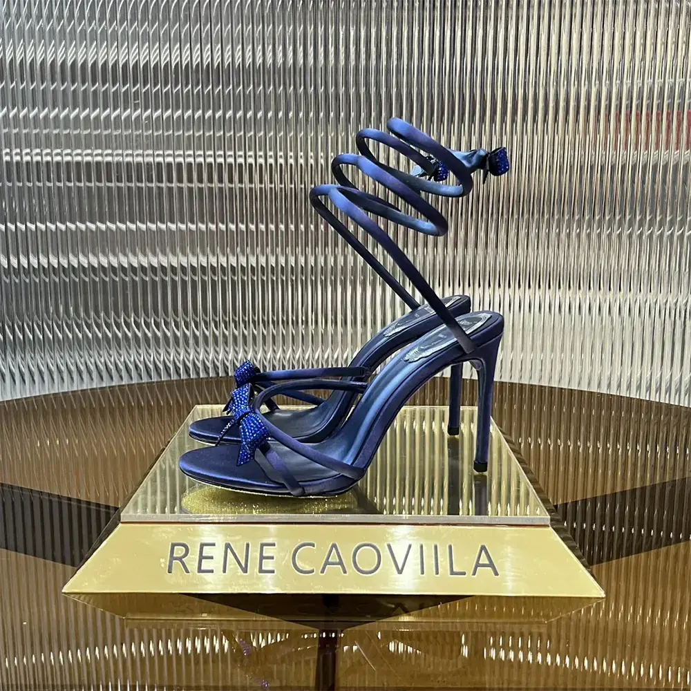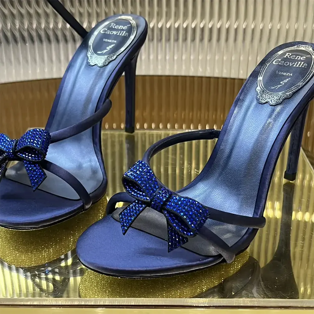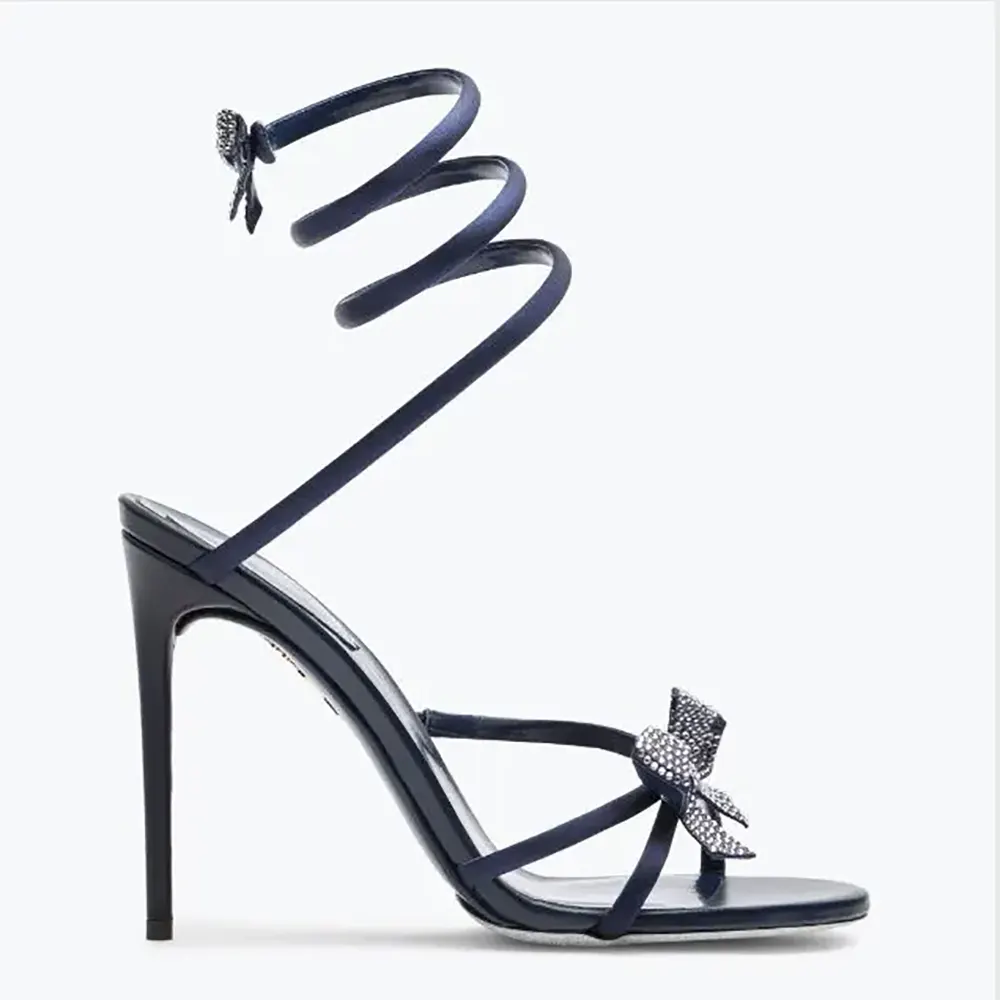 - Embellished with small bows studded with silver crystals applied to the toe and crowning the serpent spiral,