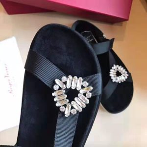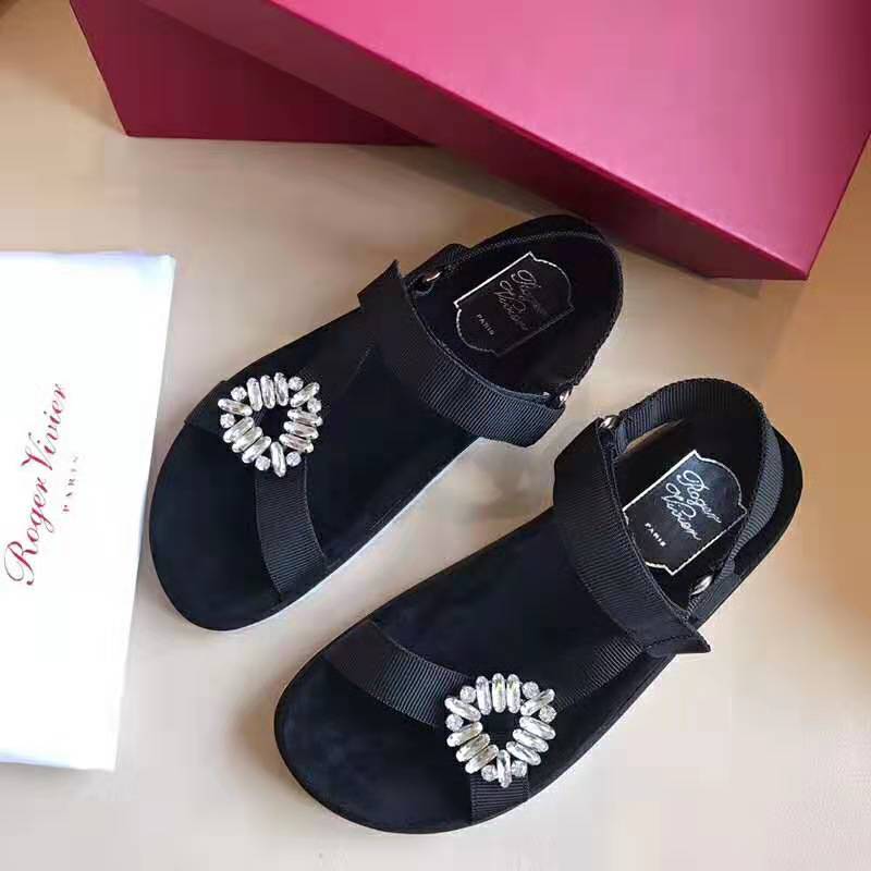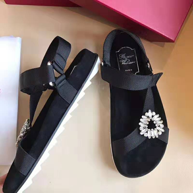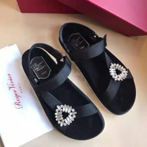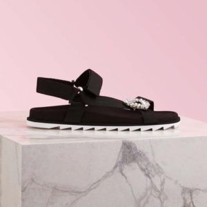 - Trekky Viv’ Sandals with gros grain panels, velcro fastening, embellished crystal buckle, molded underfoot with serrated rubber outsole.