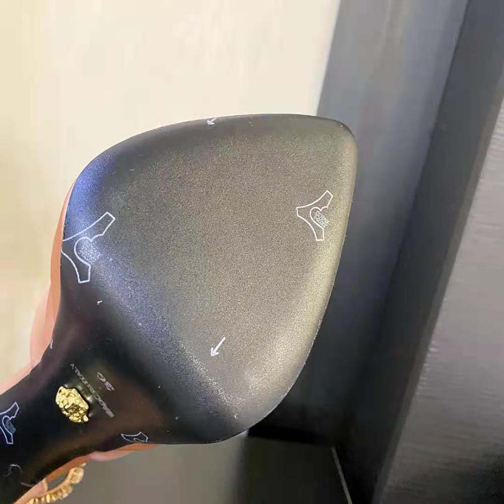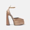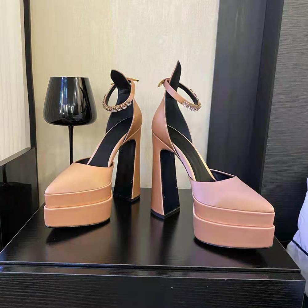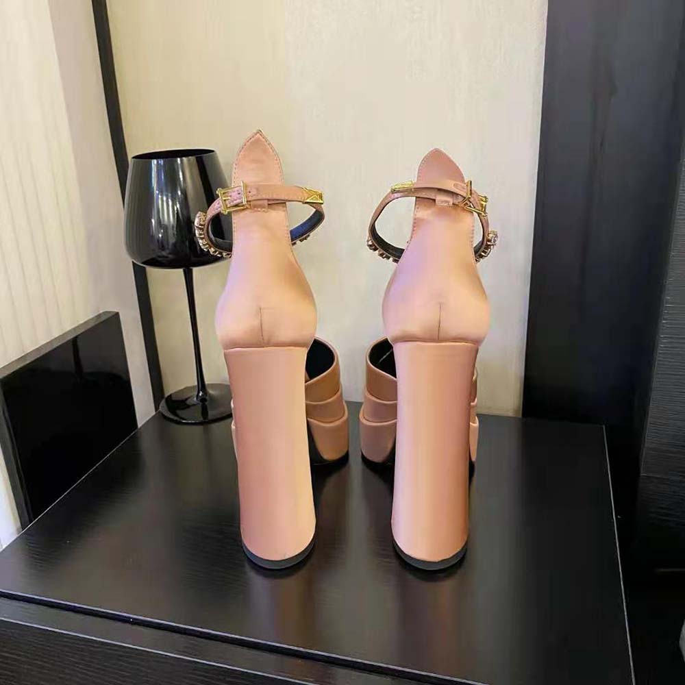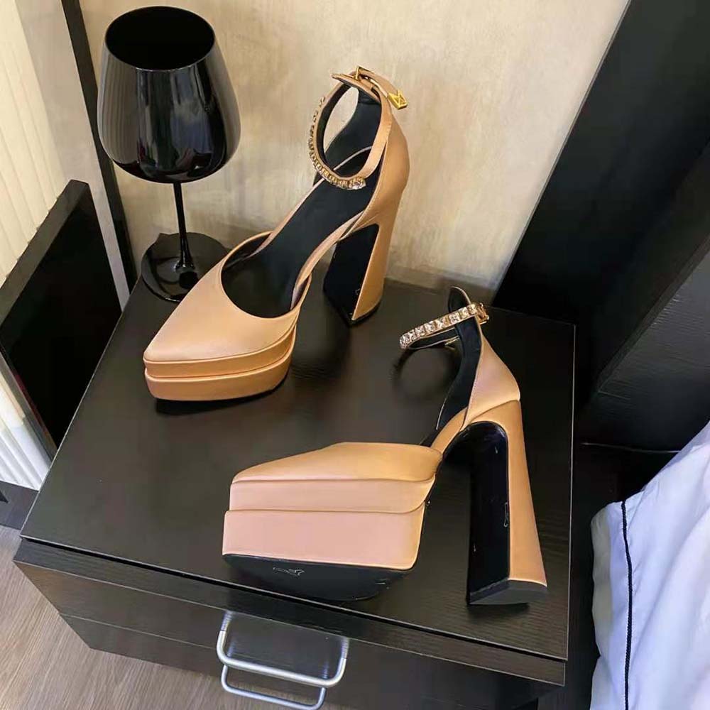 - high block heel and a double platform. The ankle strap is adorned with rhinestones and V-shaped hardware.