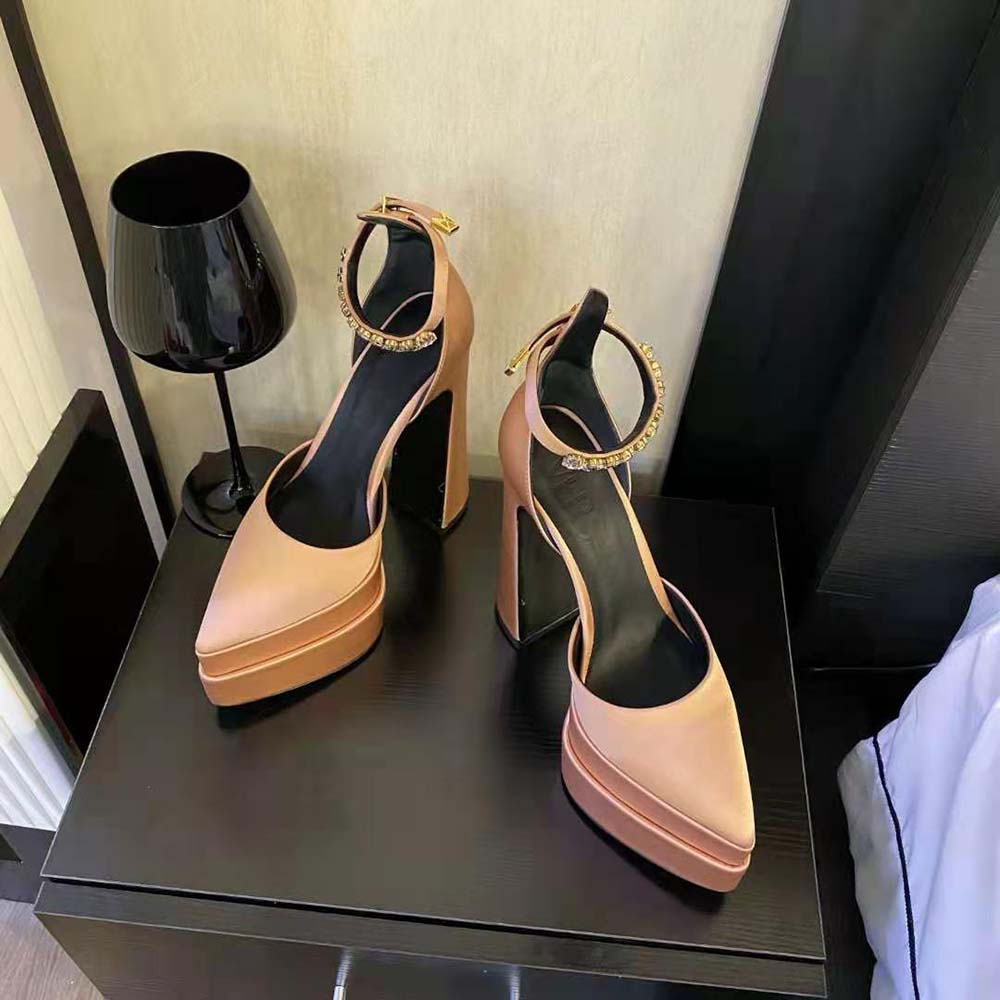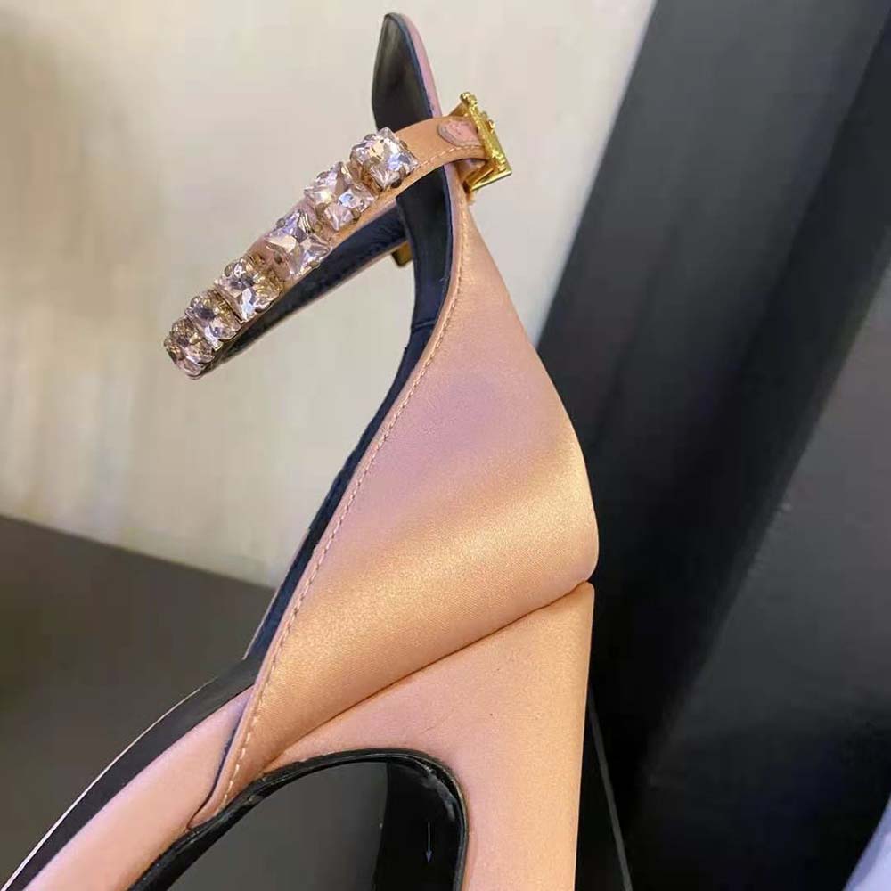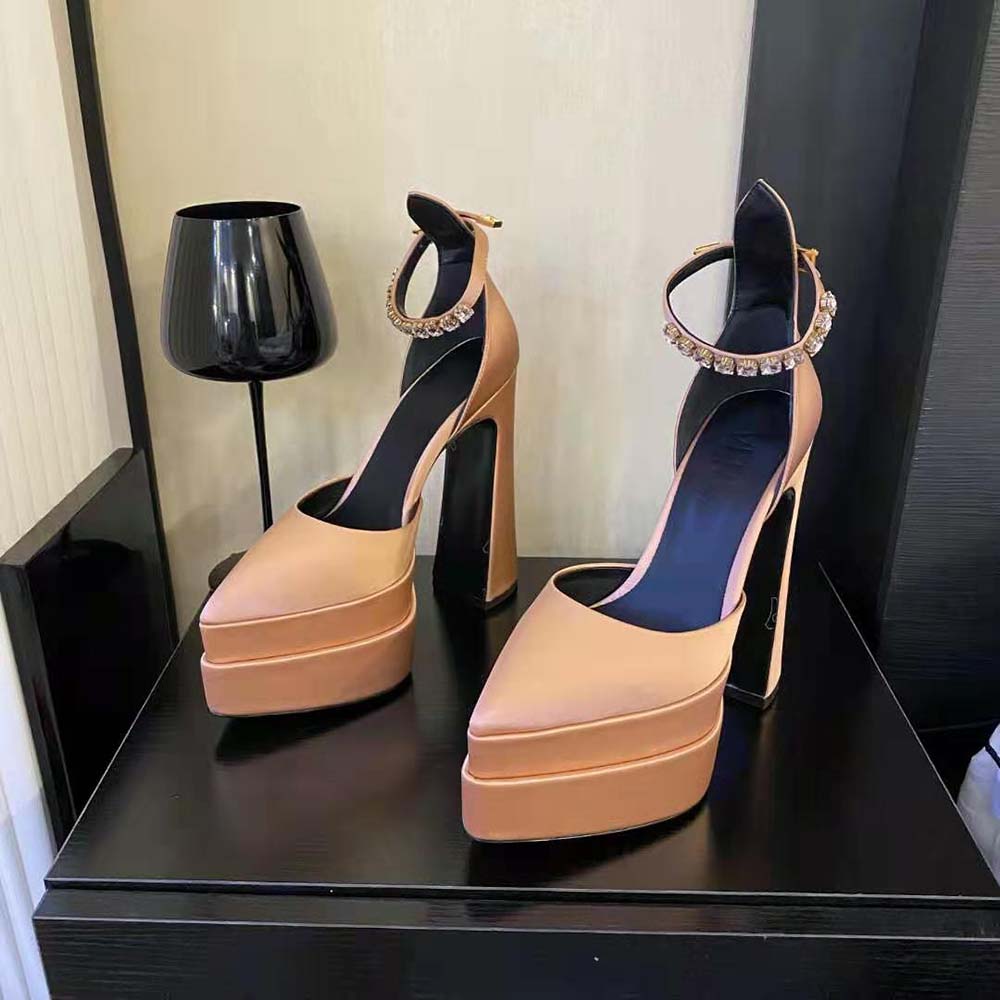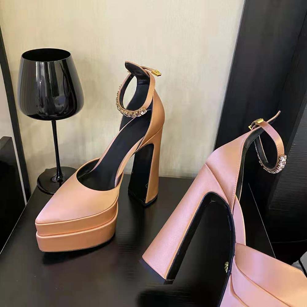 - A Very Versace pointed proposal from the signature Aevitas line, these satin pumps feature a slanted,