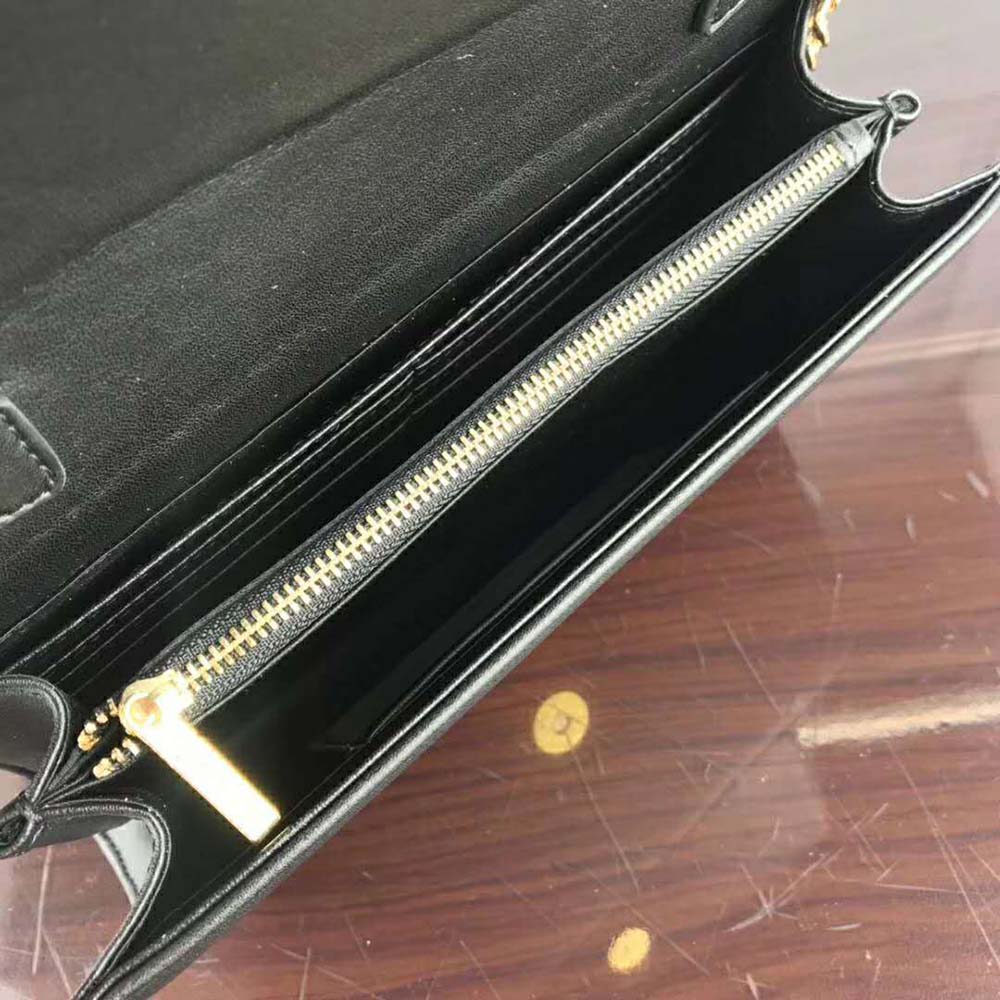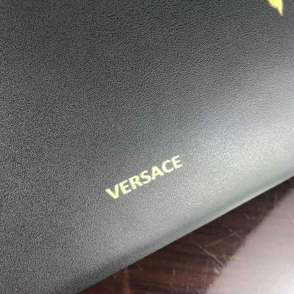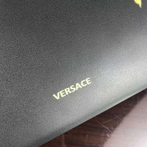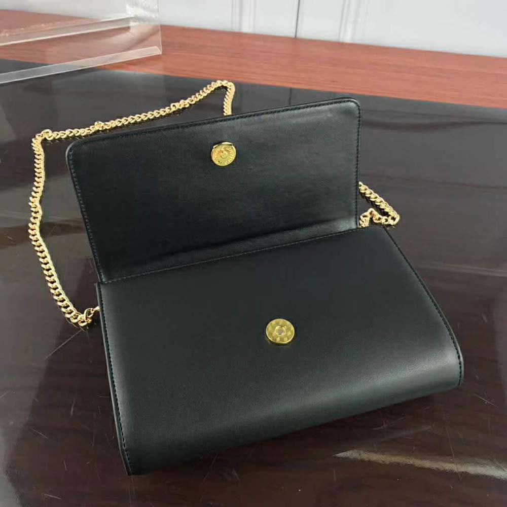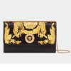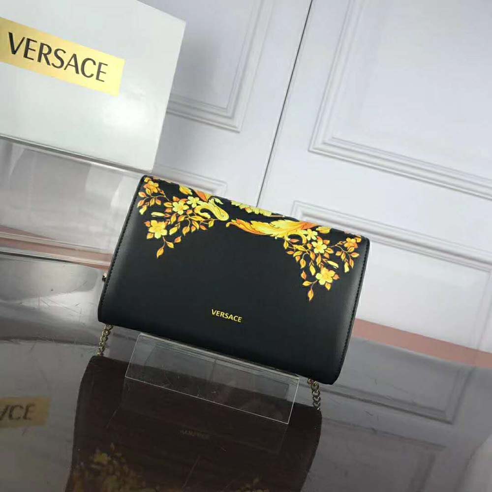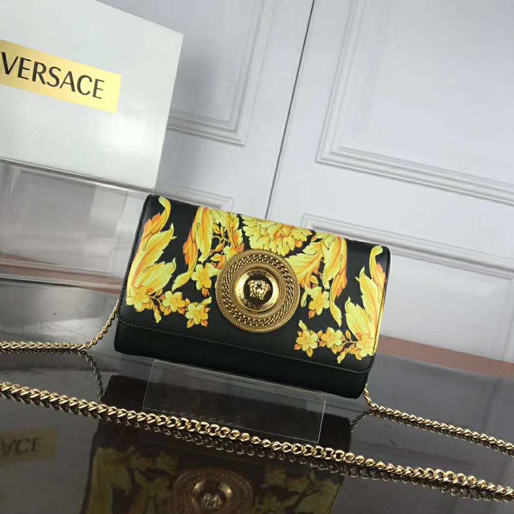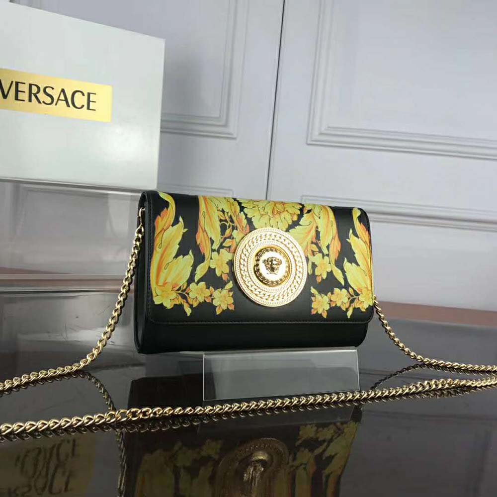 - This Barocco SS’92 evening bag features a removable metal chain shoulder strap and a flap-over closure with central Medusa plaque.