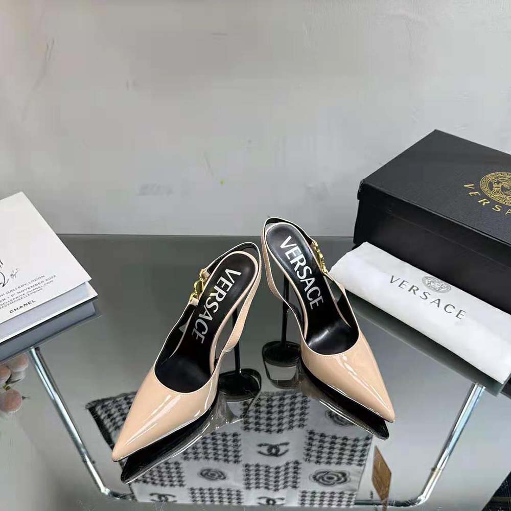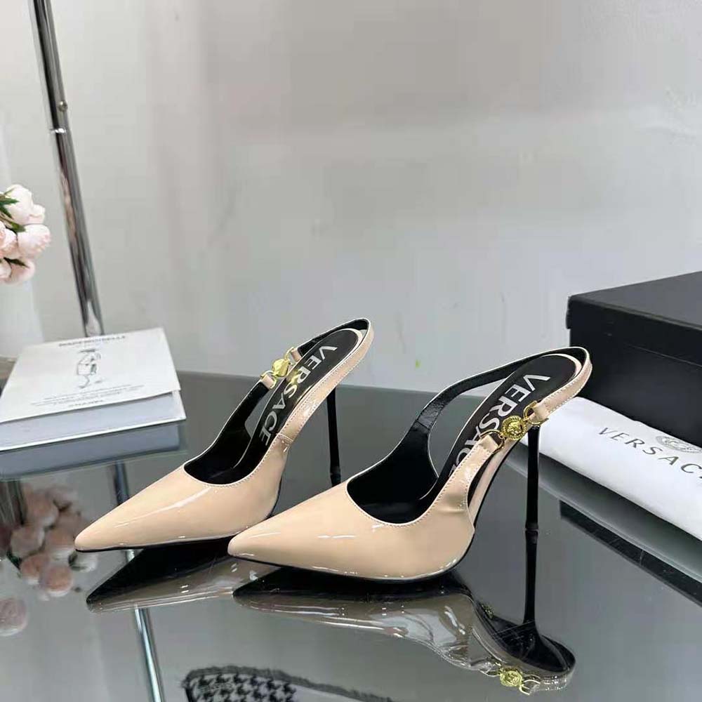 - with a squared toe and a Medusa ’95 emblem at the slingback strap.